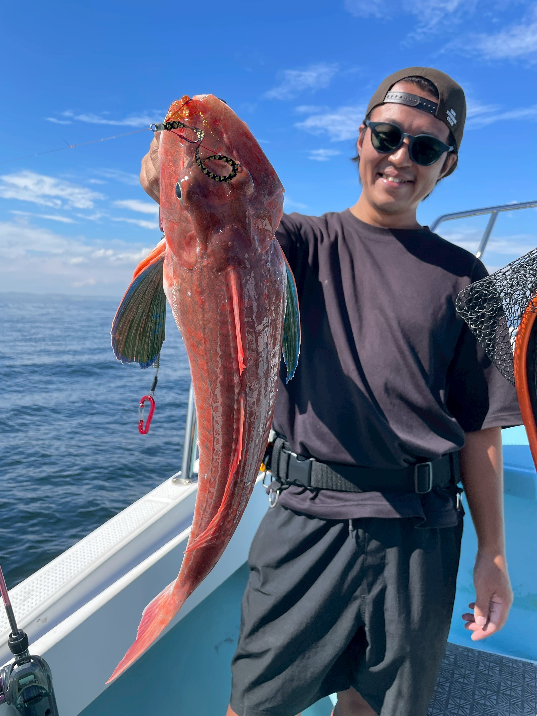一方の船では、スピニングでバーチカルではなく遠投キャスティングし、横移動を長く巻いていたそうです。